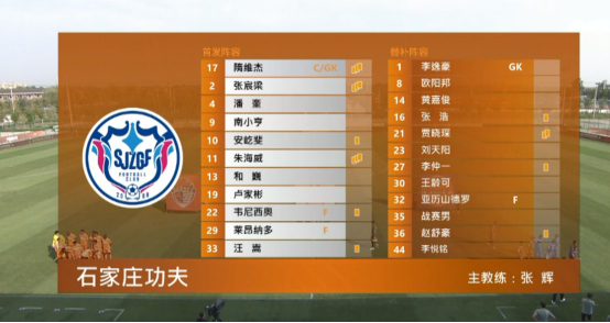 反观石家庄功夫的首发名单,中场的三核心安屹斐、朱海威、汪嵩全部首发外,莱昂纳多与南小亨代替了上场表现不佳的亚历桑德罗出现在了前锋线的位置,而卢家彬也代替罗新与和巍搭档两名边翼卫,2号张宸良、4号潘奎与22号韦尼西奥搭档出任3中卫,比起首回合的4-2-3-1,本场比赛石家庄功夫则是排出了3-5-2的阵型,在专注于防守奥努埃布与青岛海牛远射的同时,扩大了自己的防守宽度,这也是根据首回合交锋后的对策,从这样的部署可以看出,首回合青岛海牛的边路让石家庄功夫改变了只防守中路的策略,这样的防守让青岛海牛的进攻受到了更大的限制,而上半场青岛海牛最好的进攻机会还是来源于石家庄功夫后场自己的失误。