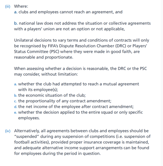 实际上这些年,国内外有关疫情带来的降薪争端不断,国际足联为此也专门出台了一些文件。其中有关降薪谈判环节是这样写的: