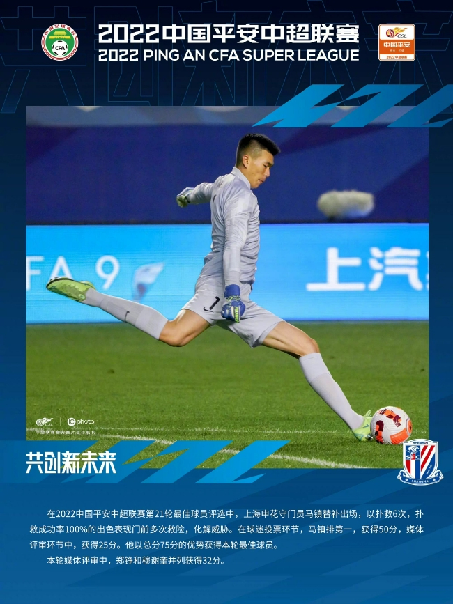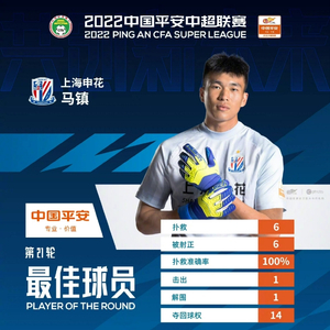 10月7日,中超官方发布了第21轮最佳球员的评选结果,上海申花门将马镇当选。