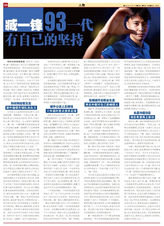 2022赛季的这个帽子戏法,对臧一锋应该是个起点,接下来,臧一锋期待着93一代都能有更长的职业足球生涯:“我们93这批球员,受到政策的影响,一路走来都比较坎坷。现在老队员退役了,我们获得了更多机会,在各自球队里都挑起了大梁。这两年很多时候都是赛会制,大家经常在一起,平时关系都很好。也会聊到各自的足球人生,都希望这批人能踢得久一点,好好享受足球的快乐,也能为中国足球多贡献一些东西。至于现在足球的大环境,这不是我们能左右的。我们要做的就是提升自己,做好自己,碰到再大的困难,也要咬牙坚持下去。”