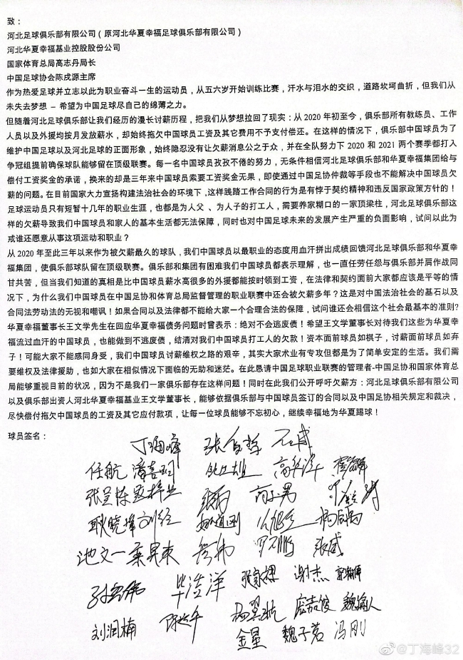 从河北队多达36名球员集体签名的讨薪书上,控诉了俱乐部3年来的欠薪行为。表示球队从2020年初至今,俱乐部所有的教练员、工作人员以及外援都按月发放薪水,只有中方球员的工资及其他费用不予支付偿还。