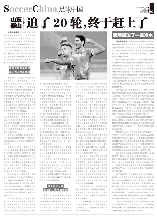 记者陈永报道 中超第二轮,山东泰山不敌河南嵩山龙门,从那场比赛之后,泰山队就一直落后于武汉三镇,在随后20轮的比赛中,泰山队苦苦追赶,最终在这一轮补赛中凭借3比1战胜实力强劲的上海海港追平了武汉三镇,至此,泰山队用了整整20轮比赛才和武汉三镇回到了同一条起跑线。追平武汉三镇的同时,也彻底打破了上海海港夺冠的希望,最后12轮比赛,冠军之争恐怕不会再有介入者了。