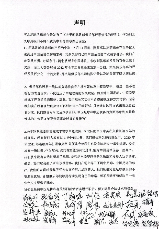 1、河北足球俱乐部的声明当中称:7月31日前,除某离队高薪球员存在争议无法满足中国足协欠薪要求外,其余欠薪均已按中国足协的节点要求补齐。我们在此郑重声明:时至今日,河北队所有中国球员并未收到俱乐部发放的百分之三十欠薪,而且大部分球员2022年全年工资更是未发放一分钱,如果俱乐部真的已经发放百分之三十的欠薪,那么请俱乐部出示转账记录以及球员签字确认的证据。