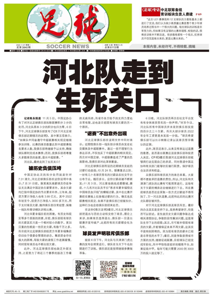 记者陈永报道 11月5日,中国足协公布了对河北足球俱乐部扣除联赛积分3分的处罚,河北队原本3分的积分也归为零。6日下午,河北足球俱乐部发布了《关于河北足球俱乐部近期情况的说明》,其中第五项表示:“如果队中同意遵守中超联赛相关规定继续参加训练、比赛的球员数量达到中超联赛报名要求人数,我俱乐部将继续予以支持,确保球队顺利完成本赛季;否则,我俱乐部将尊重大多数球员的意愿,退出中超联赛。”