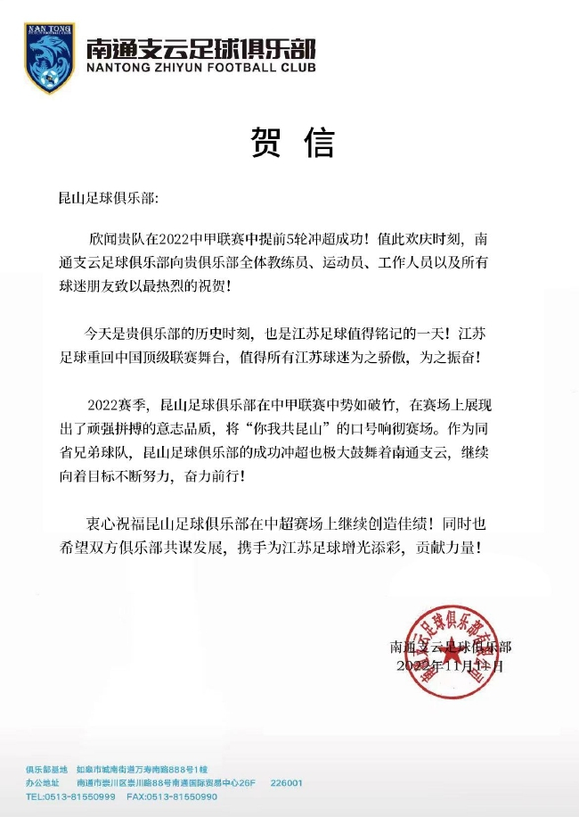 欣闻贵队在2022中甲联赛中提前5轮冲超成功!值此欢庆时刻,南通支云足球俱乐部向贵俱乐部全体教练员、运动员、工作人员以及所有球迷朋友致以最热烈的祝贺!
