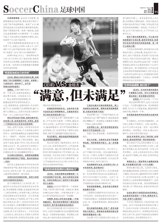 世界杯首轮战至现在,六支亚洲球队已有五支亮相,最后一支出场的,恰恰就是金敃友的祖国球队——韩国队。作为上一届世界杯的参与者,对于世界杯,对于亚洲足球,金敃友有很多自己的理解,他看好韩国队能够杀进16强,也希望自己的偶像梅西能够圆世界杯冠军的梦。