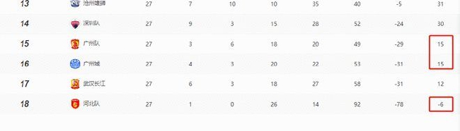 河北队惨败 中超27轮后-6分 提前7轮降级