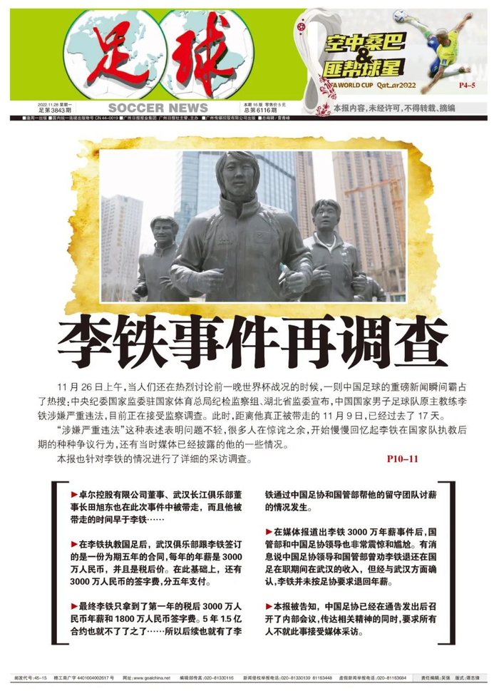 记者程善报道 11月26日上午,当人们还在热烈讨论前一晚世界杯战况的时候,一则中国足球的重磅新闻瞬间霸占了热搜:中央纪委国家监委驻国家体育总局纪检监察组、湖北省监委宣布,中国国家男子足球队原主教练李铁涉嫌严重违法,目前正在接受监察调查。此时,距离他真正被带走的11月9日,已经过去了17天。
