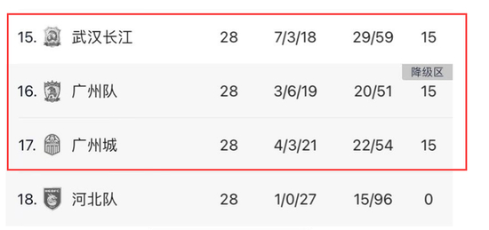 与此同时,广州城和广州队这对难兄难弟,先后输给天津津门虎和成都蓉城。最终,武汉长江跟广州两兄弟同积15分,但刚好比广州队多一个净胜球,所以他们暂时可以逃离降级区。