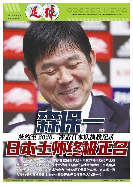 虽然已没有悬念,日本足协选择2022年结束前3天官宣森保一续约,合同长达4年的事实还是令日本媒体有些讶。12月28日日本足协召开临时技术委员会和董事会会议,正式确认与54岁的森保一续约。同时作为世界杯表现出色的奖励,续约后森保一的年薪也从1.5亿日元涨到2亿日元(折合140万欧元)。