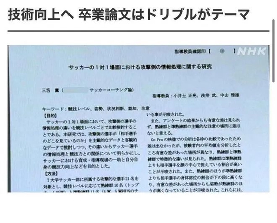 三笘薰就读筑波大学时,曾用Gopro微型摄像头以自己和队友为研究对象,撰写了名为《1对1情境下进攻球员盘带过人的信息处理研究》的论文。中国球迷称为“三球王”的日本边锋,也因此被冠以“自主研究”过人王的头衔。但三笘薰的过人技术其实早在高中时代就已成型,高中毕业后选择读大学,是因看到年长1岁的三好康儿和板仓滉出色表现,对职业生涯取得成功极不自信。那篇大学论文没成为他开始职业生涯的敲门砖,只是为他的人生增添了一些戏剧色彩。