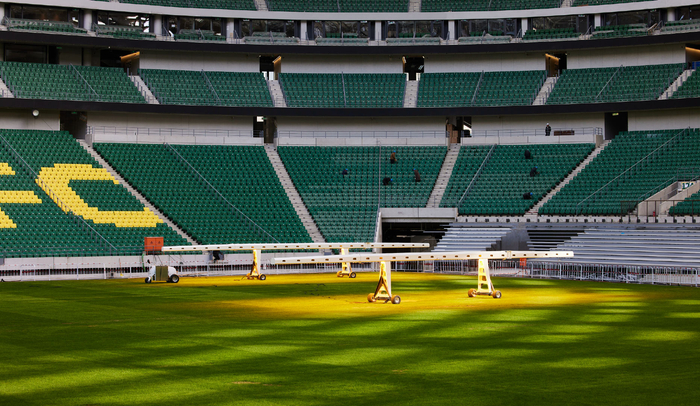 新工体的足球场草坪已经铺设完毕,正处于养护阶段。草皮系统是国际主流的锚固草系统,设有地下通风、地暖加热和自动喷灌装置,符合承接世界杯和洲际大赛的标准。智能补光组目前正在工体内工作,参照草皮生长的最适宜环境参数,根据场馆内遮光程度的不同进行补光养护。