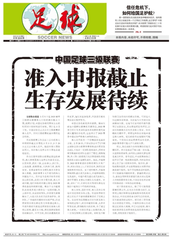 记者陈永评述 3月5日是2023赛季三级职业联赛准入申报的最后截止日期,按照计划,中国足协将用两周左右的时间对申报材料进行审核,预计在3月下旬,中国足协会正式公布三级联赛的准入名单,同时三级联赛的递补情况也会明朗。