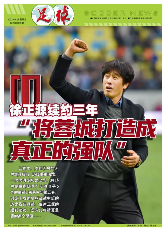在接受本报专访时,老徐曾表示,希望用自己的一点点的努力,去帮助中国足球的发展。这样格局和谦逊的态度,也让他的这次成功续约,收获到了成都球迷的掌声。而在官宣续约的视频中,徐正源也表示,他未来的目标是将蓉城打造成真正的中超强队。