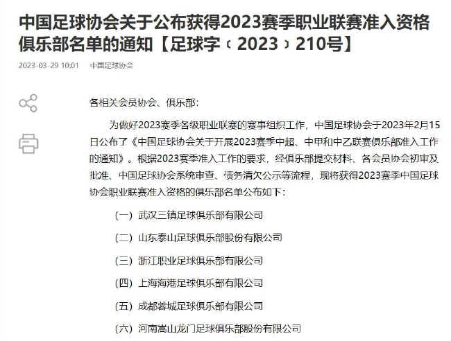足协公布2023职业联赛准入资格俱乐部名单