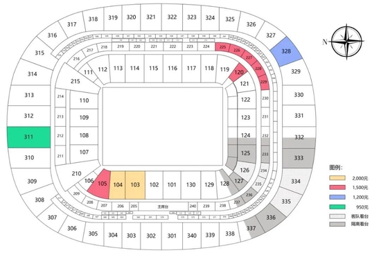 为了满足球迷的观赛需求,俱乐部研究决定增加开放103区(2000元档)、104区(2000元档)、105区(1500元档)、120区(1500元档)、225区至229区(1500元档)、328区(1200元档)、311区(950元档)供球迷选择,共计4808个座位。