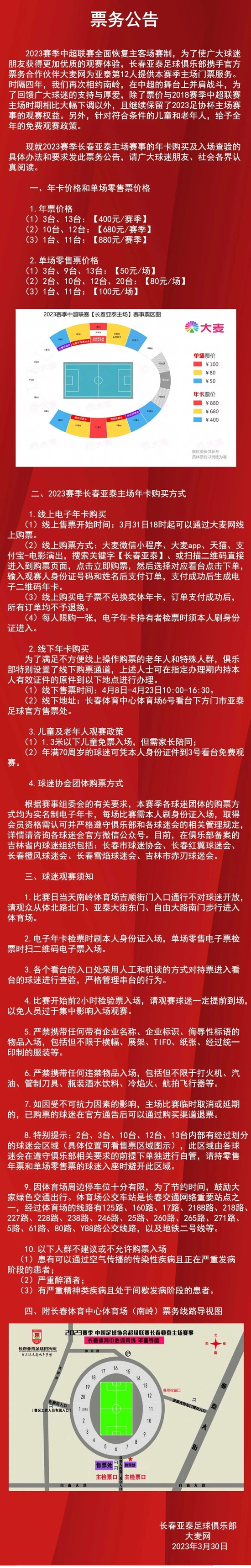 3月31日18时,2023赛季长春亚泰主场年票正式上线,大麦微信小程序、大麦APP、天猫、支付宝-电影演出等线上购票渠道均将开通,亚泰第12人可搜索关键字“长春亚泰”进入购票页面,购买电子年票。时隔三年,“南岭”将再次开门迎客,为了感恩广大球迷的不离不弃,俱乐部对2023赛季年票及单场门票价格进行了调整,相较2018赛季中超联赛主场时期都有大幅的下调。另外,针对符合条件的儿童和老年人,给予全年的免费观赛政策。