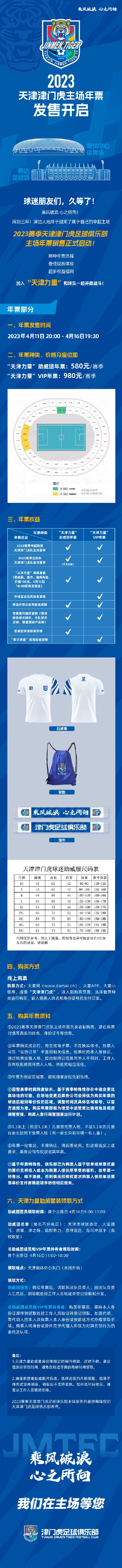 本报讯(记者 顾颖)昨天傍晚,天津津门虎俱乐部对外发布了2023赛季球队主场比赛年票的发售公告,购买端口于昨天晚间正式打开。除年票的销售外,按计划,4月16日津门虎队首个主场的门票,从今天开始发售。