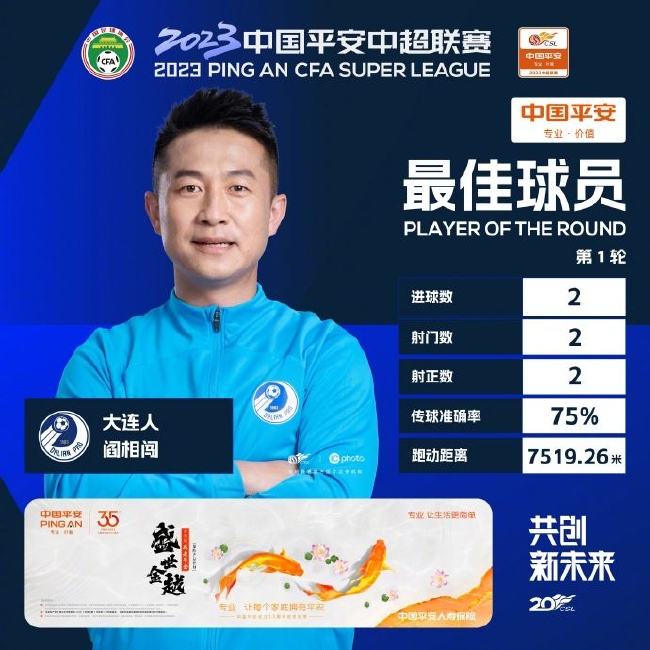在4月15-16日进行的第1轮比赛中,@大连人职业足球俱乐部 阎相闯在比赛开始仅4分钟就打入了本赛季中超联赛的第一粒进球,随后他在第7分钟小角度射门得分梅开二度,帮助大连人2比1击败南通支云。阎相闯全场比赛2次射门,全部射正且进球,展现了非常高的效率。