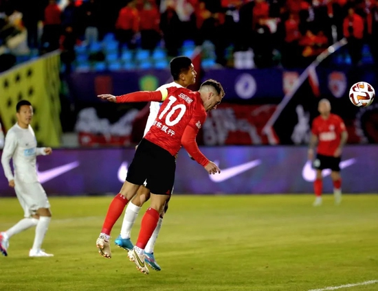 第7分钟,谭龙边路传中,劳烈斯头球解围,汪晋贤得球射门偏出球门。
