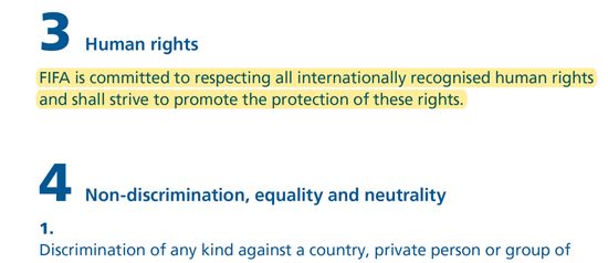 3。 FIFA章程(第三条)承诺尊重并保护国际广泛认可的公民权利,这其中包括自我表达的权利。该权利受《中华人民共和国宪法》第三十五条明确保护。