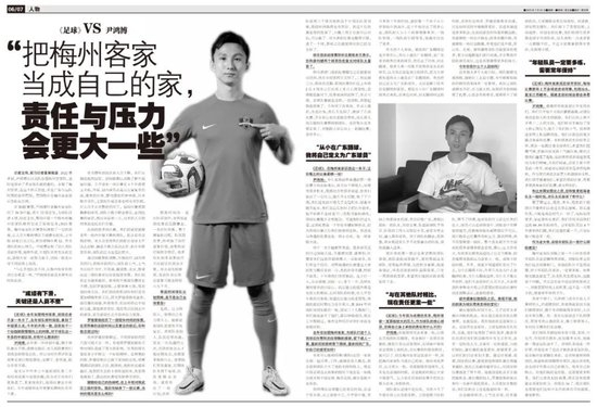 尹鸿博:我觉得责任会更重一些,以前在其他的队伍踢球,我会做好一名球员该做的,像把日常生活管理好,在训练中展现状态得到上场机会,在比赛的时候发挥好,就可以了。但在梅州客家这里却不一样,我把梅州客家队当成自己的家,相对来说责任、压力更大一些。我要鼓励其他球员,尤其是在逆境的时候,在连败的时候让大家不要泄气,让大家在后面的比赛中把状态展示出来,争取胜利。