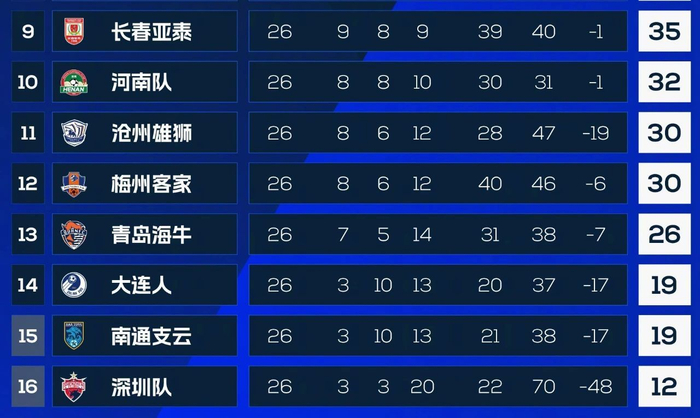 大连人靠着这1分,在多赛一场的情况下,积分追平了南通支云。由于大连人队胜负关系占优,所以大连人队在排名上也力压南通支云队,来到了倒数第三位。