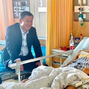 10月31日上午,国安俱乐部周金辉董事长到医院看望比赛中受伤的王刚。在询问了手术情况和康复预期后,周董说,你现在肋部加了钢板,以后就更加是名副其实的“钢铁战士”了。