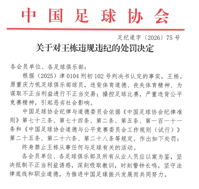 根据罚单内容显示,王栋在效力重庆力帆期间出现不正当交易,被处以终身禁足。