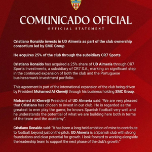 阿尔梅里亚的官方公告称:“克里斯蒂亚诺-罗纳尔多通过CR7 S.A集团的子公司Sports Investments收购阿尔梅里亚足球俱乐部25%的股份,在俱乐部和葡萄牙商人投资版图的扩张中迈出了重要一步。”