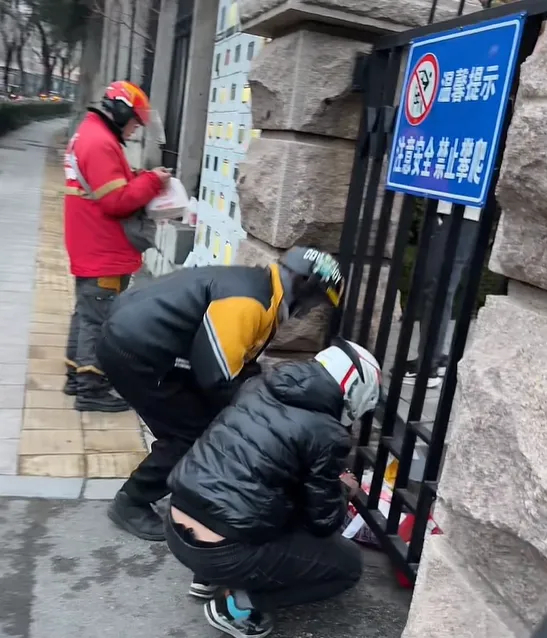 “给大学生们送餐,校园也不让进,都是挂在大门上的,拍照送达,孩子们就这么来拿,哎,不容易。”