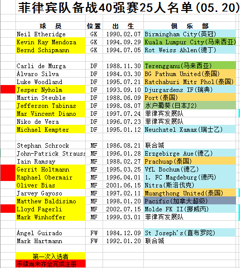 菲律宾名单千呼万唤始出来 逼平国足之队仅剩11人