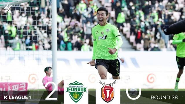12月5日,韩国K联赛冠军附加赛第五轮,全北现代2-0击败济州联,以76分力压蔚山现代,夺得本赛季K联赛冠军。全北现代目前成为韩国职业足球历史上首支联赛五连冠的球队,获得9次联赛冠军刷新K联赛夺冠次数(城南FC以7个冠军排名第二)。