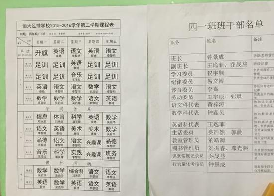 这是四年级一班的课程表和班干部名单。可以看到,每天的足球训练不超过一个半小时。据校方介绍,恒大足校学生包含小学三年级到高中三年级共10个年级,学生来自全国各地。此外还有来自13个国家的20余名外籍学生。