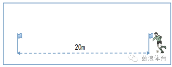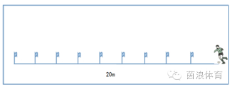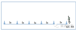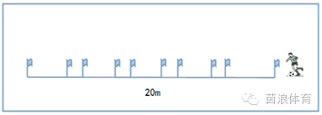 测试场地:平整的人工草或天然草足球场,划定20米×5米区域。起点距第一个杆距离4米,其余杆距2米,起点距终点20米(图10)。
