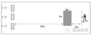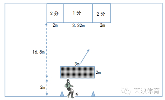 测试场地:平整的人工草或天然草足球场罚球区或足球墙,射门区距球门或足球墙16.8米,起点距射门区域2米,射门区3米×2米(图15)。