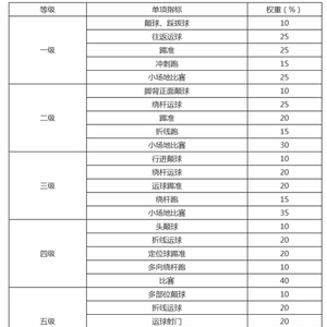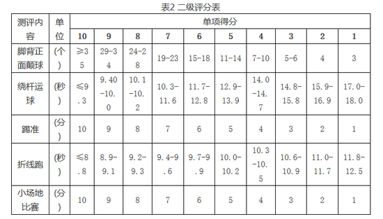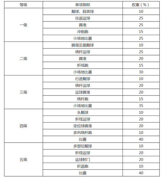2。《标准》从球感、运球、踢球、身体素质和比赛能力五个方面综合评价学生足球技能水平。根据学生掌握足球运动技能的规律,《标准》将学生足球运动技能划分为五个等级,每个等级的测评内容体系不同,每个等级都具有相对独立的评分标准。