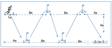 测试场地:平整的人工草或天然草足球场,22米×5米区域。起点终点距离20米,标志杆宽间距4米,长间距8米(图6)。