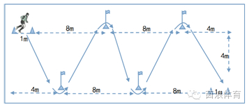 测试方法:听测评员口令后,以站立式起跑姿势从起始线开始加速跑,依次绕过间隔2米的8个标志杆,冲过终点线为结束。