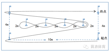 测试方法:听测评员口令后,从起始点采用站立式起跑,按照规定路线,依次越过各标志杆后冲过终点。