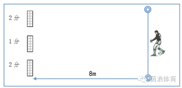 测试方法:听测评员口令后,在起始线上用脚内侧踢地滚球的方式将球踢进距起始线8米处的三个足球门,每人5球。