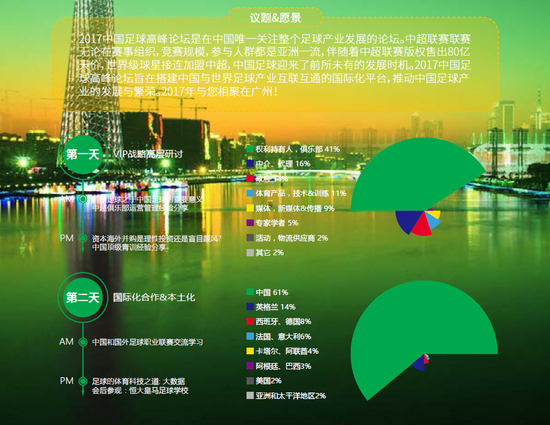 对于那些渴望发现新的投资和商业机会或者加强在中国市场曝光度的企业来说,两天的盛会将提供给您丰富的机会与未来的合作伙伴接触。2017中国足球论坛将主要围绕:“中国足球产业形势:战略,未来计划”、“广州足球城的建设”、“中超俱乐部运营管理经验分享”、“国际俱乐部的经验如何为中国俱乐部所借鉴”、”中国资本海外并购足球资产,理性投资或盲目跟风?”、”足球的体育科技之道: 大数据”、”体育康复和医疗的重要性” 等几大议题 与您一到共同挖掘中国足球所蕴含的巨大商机。