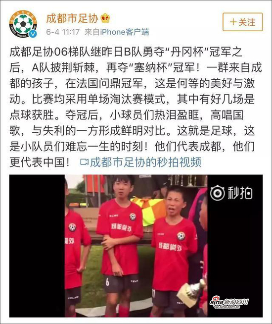 这并不是棠外足球第一次收获如此热度。去年6月,一段中国足球少年在法国手捧奖杯,围成一圈含泪高唱国歌的视频在网上被广泛传播,观者无不被这群中国孩子所感动。而视频中的这群少年,正是来自棠外的足球小将们。