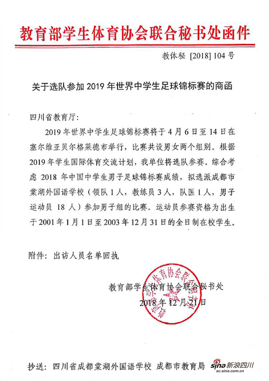 2019年世界中学生足球锦标赛将于4月6日至14日举行,受教育部委派,棠外男子足球队将代表中国参赛。据了解,这项比赛是世界中学生足球比赛中的最高级别赛事,11人赛制要求参赛运动员必须是同一所学校的学生,鉴于历年来棠外足球队的优异表现,特别是在2018年中国中学生男子足球锦标赛中获得的优异成绩,特委派棠外男子足球队代表中国参赛,届时将有来自巴西、意大利、法国、克罗地亚等十几个足球强国的中学生足球队伍参加。