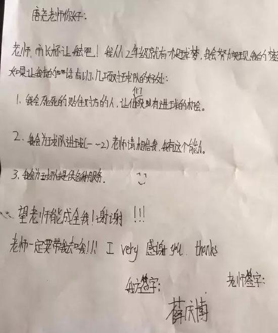 一位小学生写给足球教练的信:老师 让我去踢球吧