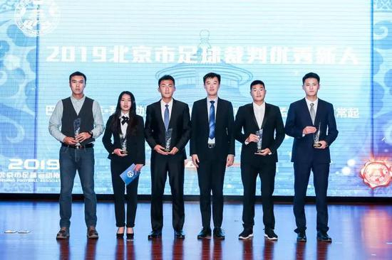北京市足协专职副主席汪江涛为巴合提别克·吾拉勒别克、白淑辉、刘建伟、孟建豪、高常起颁发优秀新人奖