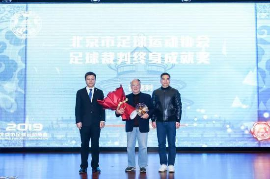 中国足协裁判委员会主任、北京市足协裁委会技术总监孙葆洁与北京市足协常务副主席兼秘书长、裁委会主任刘军为崔宝印、苏德利颁发终身成就奖