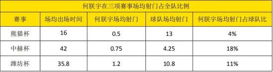 足球中轴线统计了何朕宇在2019年三项国内赛事中的11 场比赛数据,其中代表国青在熊猫杯中出赛2场,代表狼队在中赫国安杯和潍坊杯中出赛9场。由于是首次入选国字号球队,何朕宇与国青队友及球队打法都尚待磨合,所以在熊猫杯上何朕宇只是以替补前锋出战了与新西兰以及泰国的比赛,场均只有 16分钟出场时间。而在俱乐部比赛中教练安排他出场的机会明显更多,他代表狼队在中赫国安杯出场 4次首发3次,场均出场时间42分钟,在潍坊杯中出场5次首发2次,场均出场时间35.8分钟,在狼队的体系中何朕宇是介于主力前锋和主力轮换前锋之间的角色。