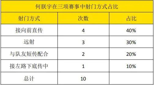 何朕宇在进攻中支配球的时间较少,不是典型的站桩型中锋,喜欢通过无球跑位创造接球机会。何朕宇在这三项赛事11场比赛中共射门10次,射正4次,射正率40%,打进2球,射门精准度较高。
