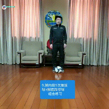 9。 脚内侧1次推拨球+脚底踩停球组合练习